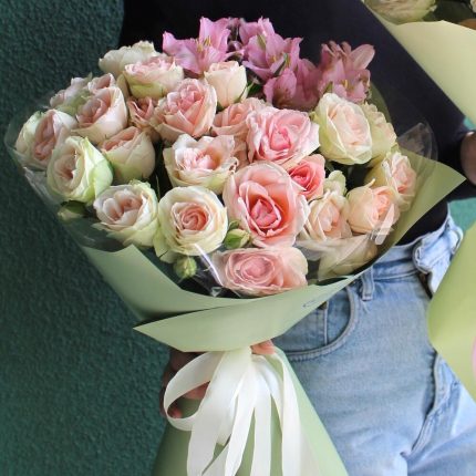Авторский букет “Маленькая нежность”: пионовидная роза, нежная гвоздика и ароматная маттиола