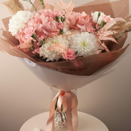 Шляпная коробка с гвоздикой, кустовой розой, гиперикумом, кустовой хризантемой “Фруктовые леденцы”