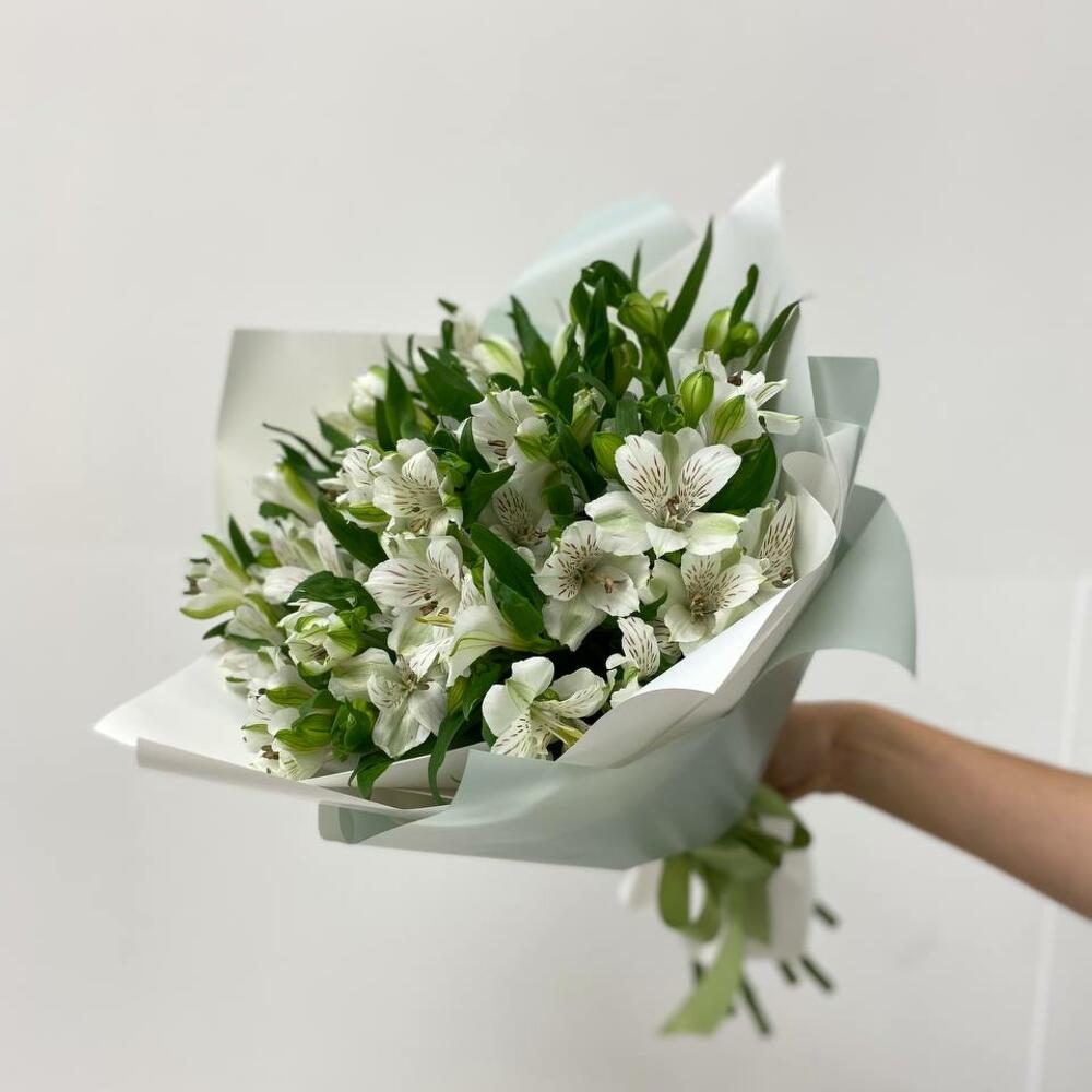 Лента – 1 шт.Альстромерия белая – 9 шт.бумага дизайнерская – 1 шт.