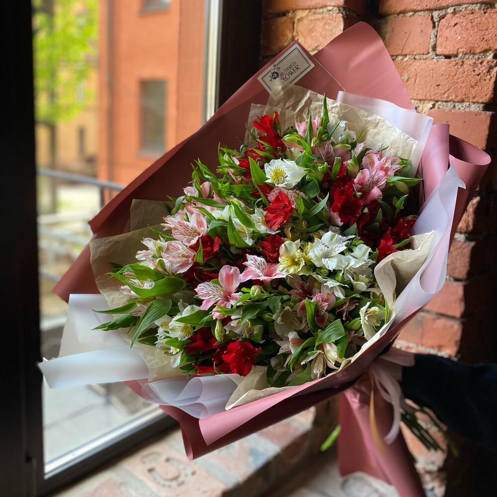 Альстромерия – 25 шт.Атласная лента – 2 шт.Упаковка дизайнерская – 1 шт.