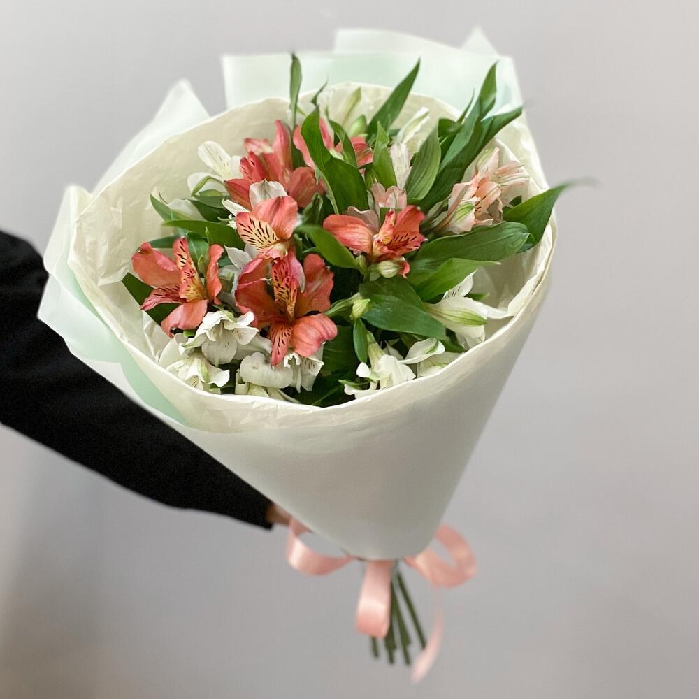 Альстромерия – 7 шт.Упаковка дизайнерская – 2 шт.Лента атласная – 1 шт.