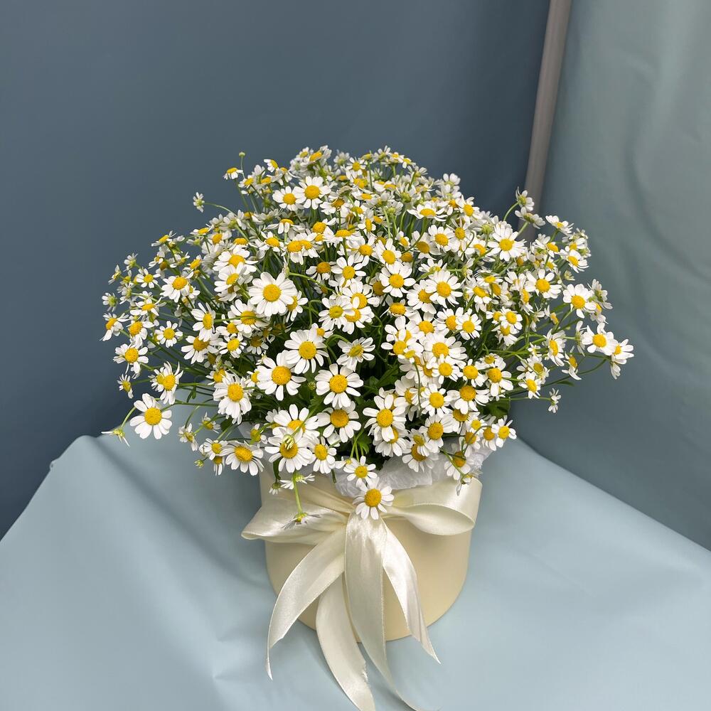 Матрикария – 11 шт.Тишью – 1 шт.Коробка шляпная – 1 шт.Лента атласная – 1 шт.Оазис флористический – 1 шт.