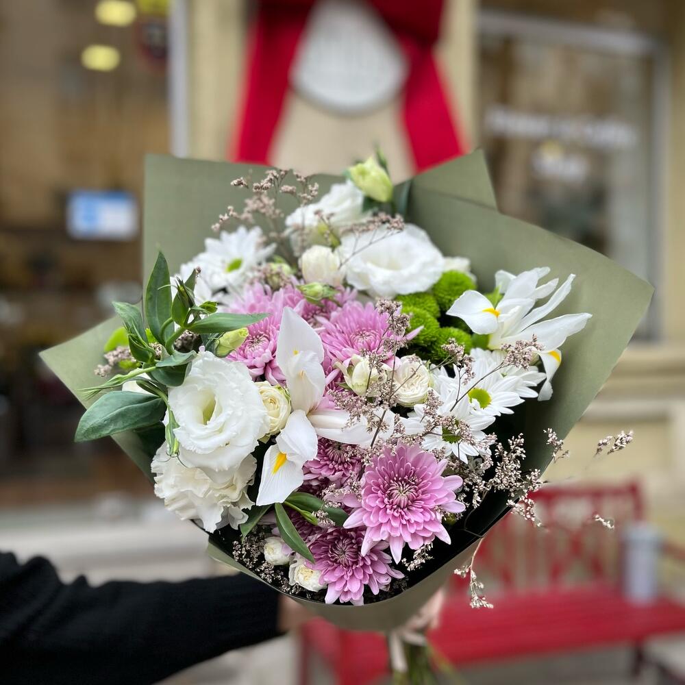 white eustoma – 2 шт. pink chrysanthemum – 2 шт. Green chrysanthemum – 3 шт. white chrysanthemum – 2 шт. spray rose pink – 2 шт. dried limonium – 2 шт.