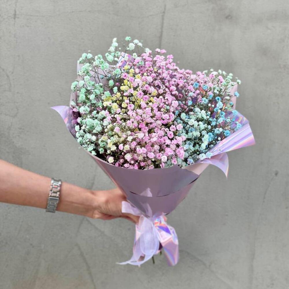 Лента атласная – 1 шт.Упаковка дизайнерская – 1 шт.Открыточка с вашими пожеланиями – 1 шт.гипсофила радужная – 5 шт.любовь флориста (бесплатно) – 1 шт.