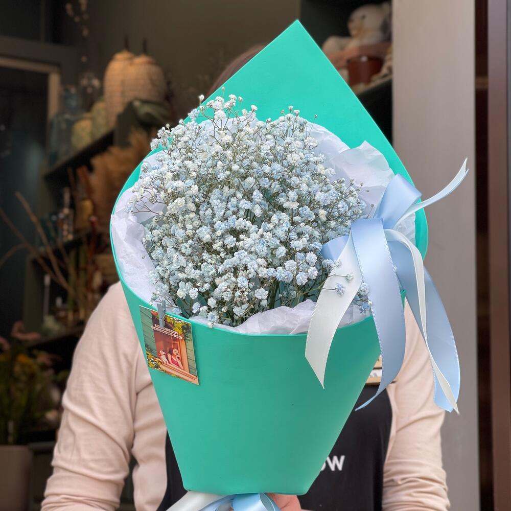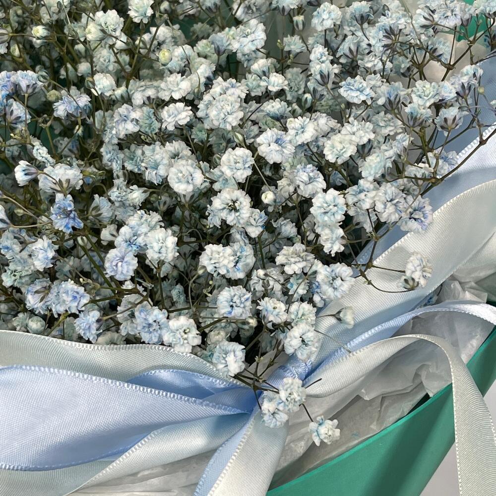 Лента – 1 шт.Упаковка – 1 шт.Тишью – 1 шт.Открыточка с вашими пожеланиями – 1 шт.Гипсофила крашеная – 3 шт.