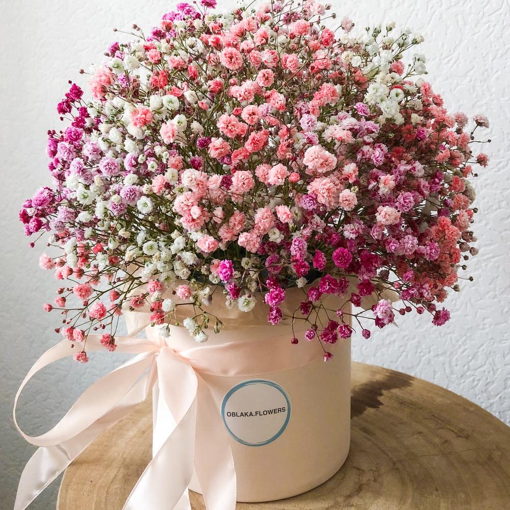 гипсофила цветная – 5 шт.Шляпная коробка – 1 шт.Флористическая губка – 1 шт.Тишью – 1 шт.Лента – 1 шт.Упаковка транспортировочная пленка – 1 шт.инструкция по уходу за цветами – 1 шт.