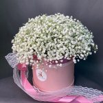 Шляпная коробка с лентами – 1 шт.Губка флористическая – 1 шт.гипсофила белая – 5 шт.