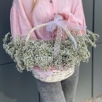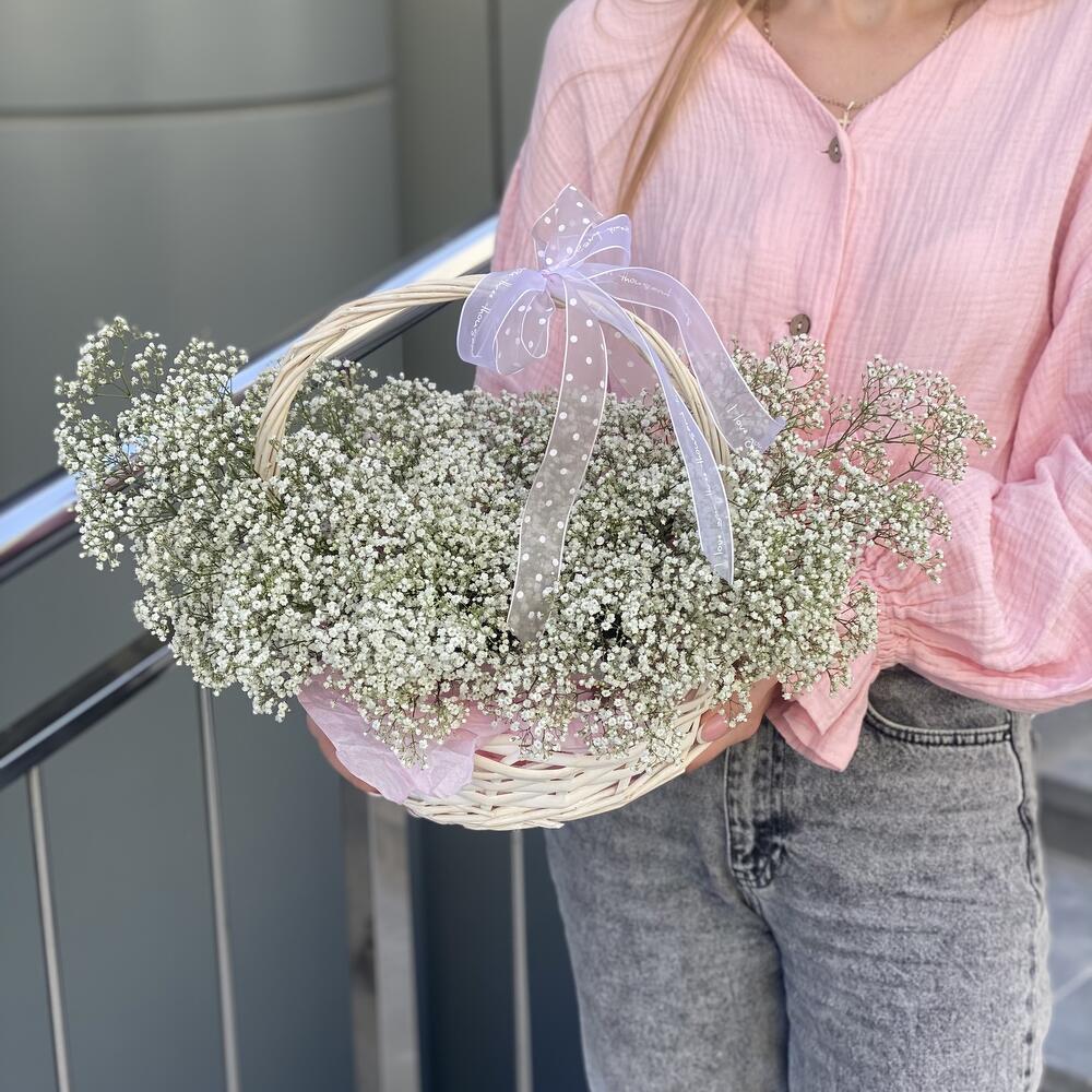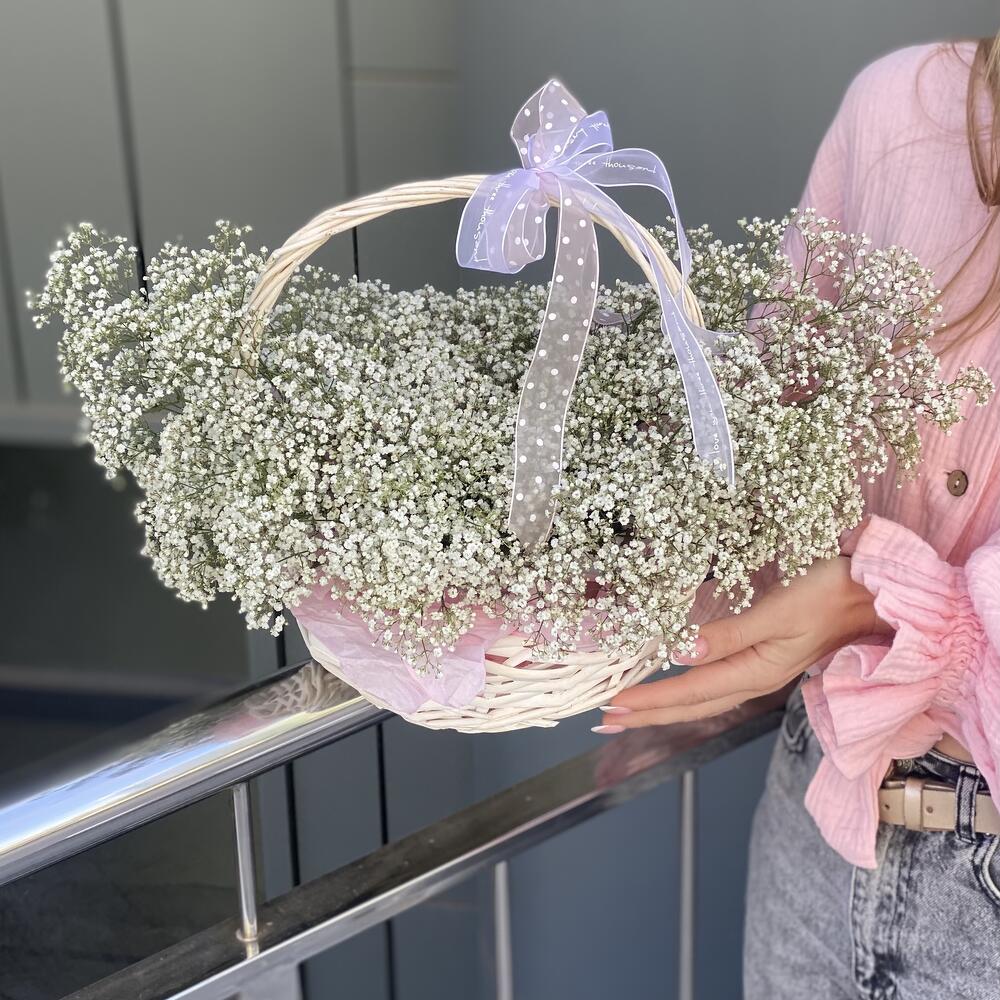 гипсофила белая – 10 шт. Корзина – 1 шт. Оазис – 2 шт. Оформление – 1 шт.
