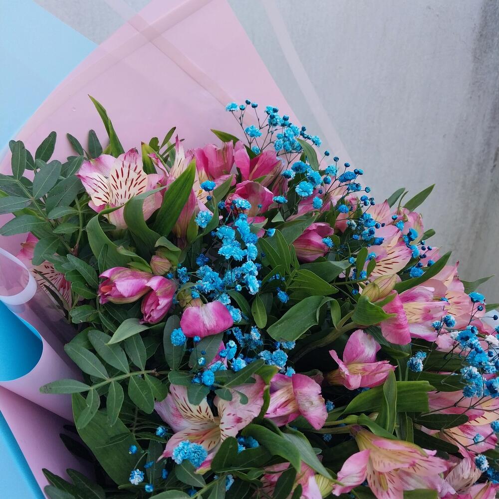 Альстромерия – 15 шт.Лента – 1 шт.Упаковка дизайнерская – 3 шт.фисташка зелень – 10 шт.гипсофила радужная голубая – 3 шт.