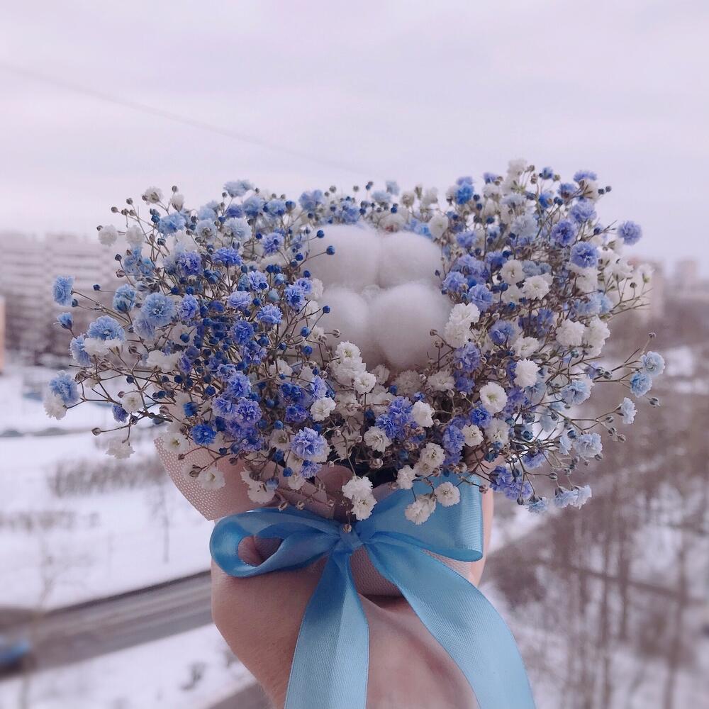 Хлопок – 1 шт.Флористическая губка – 1 шт.Гипсофила голубая – 1 шт.гипсофила белая – 1 шт.