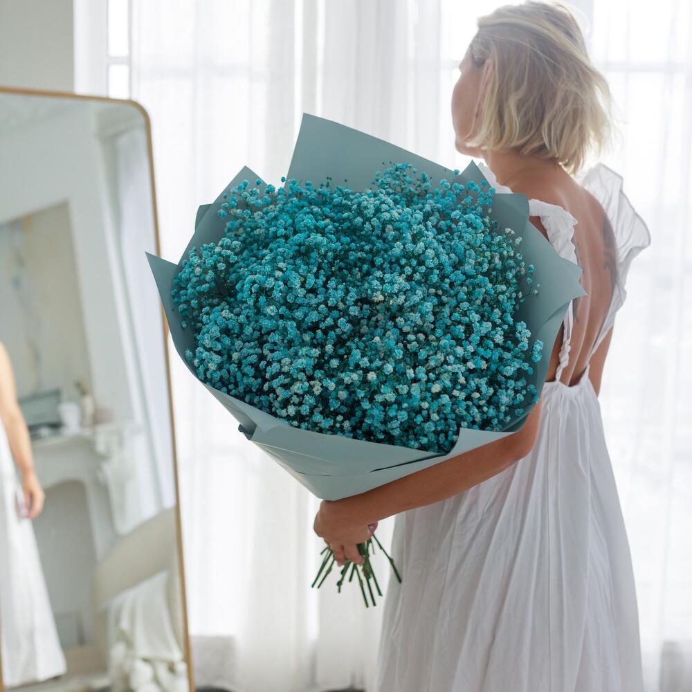 Лента атласная – 1 шт.Пленка корейская – 3 шт.гипсофила цветная – 17 шт.инструкция по уходу за цветами – 1 шт.