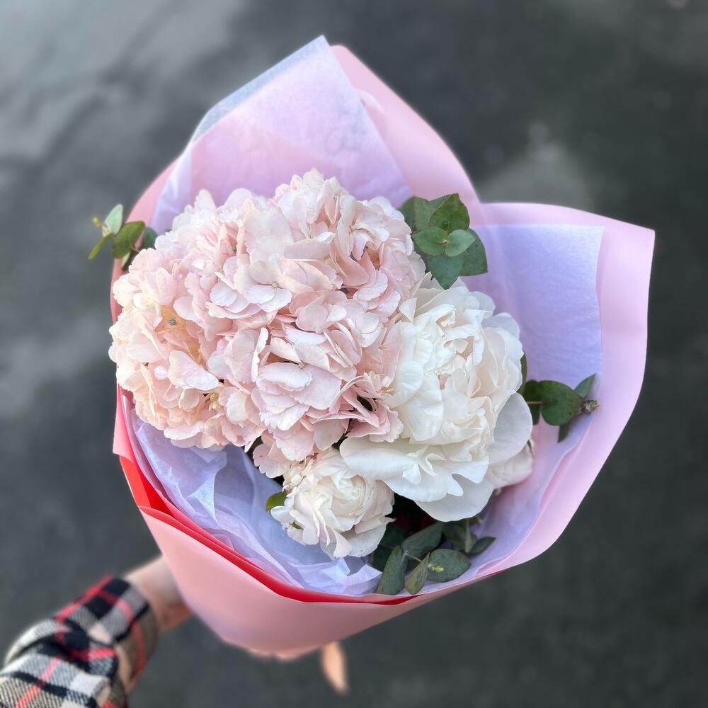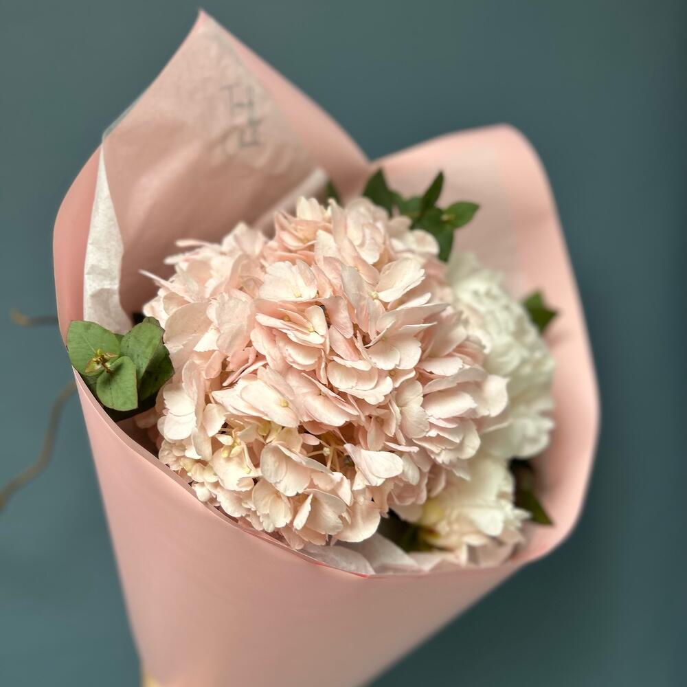 Розовая гортензия и нежные пионы с эвкалиптом в розовой упаковке