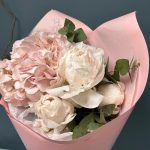 Пион – 3 шт.Эвкалипт – 2 шт.Лента атласная – 1 шт.Тишью – 2 шт.Упаковка дизайнерская – 2 шт.Гортензия розовая – 1 шт.
