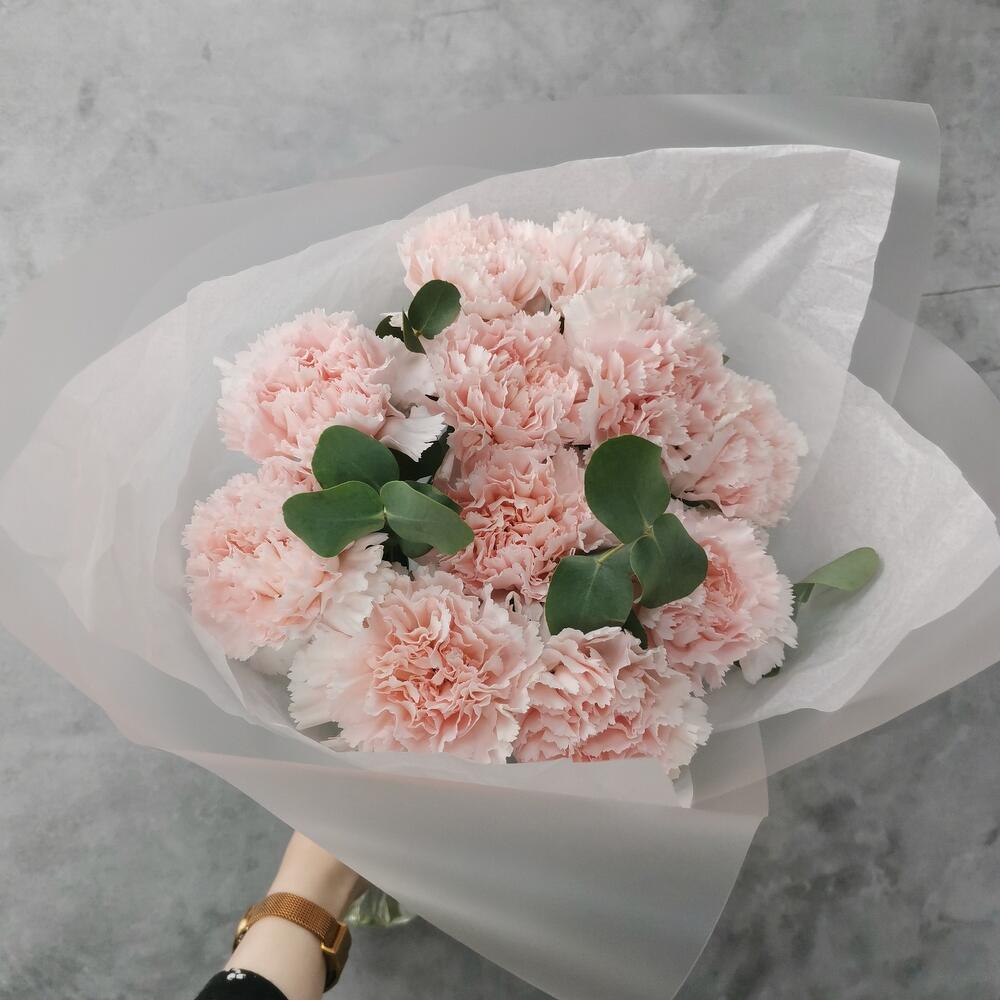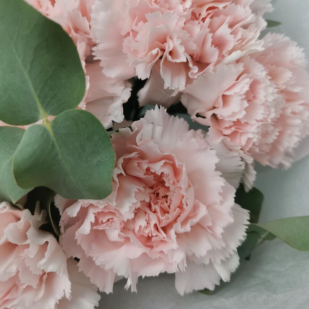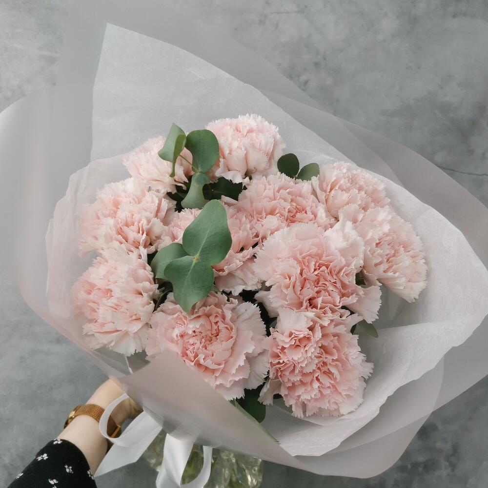11 нежных гвоздик с эвкалиптом