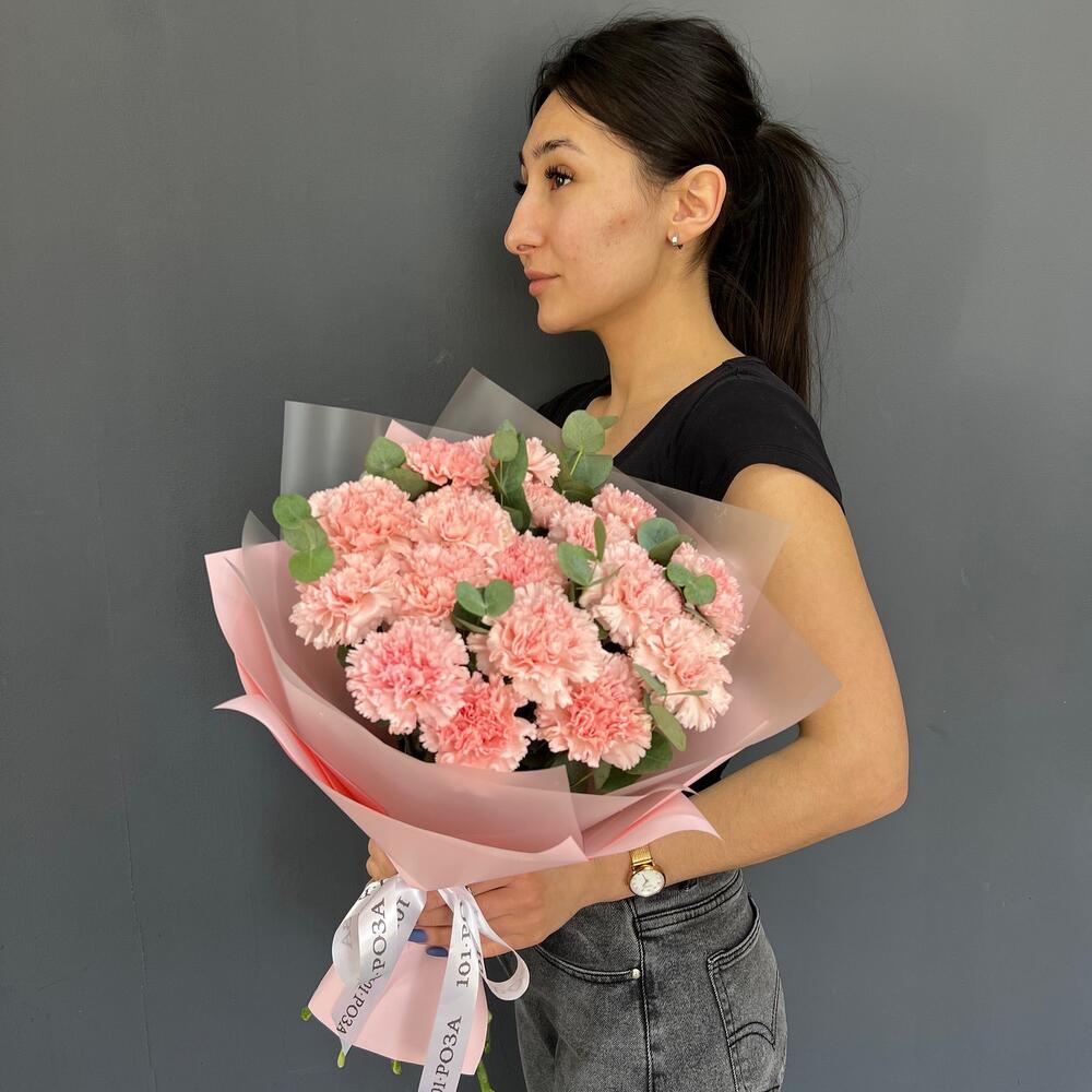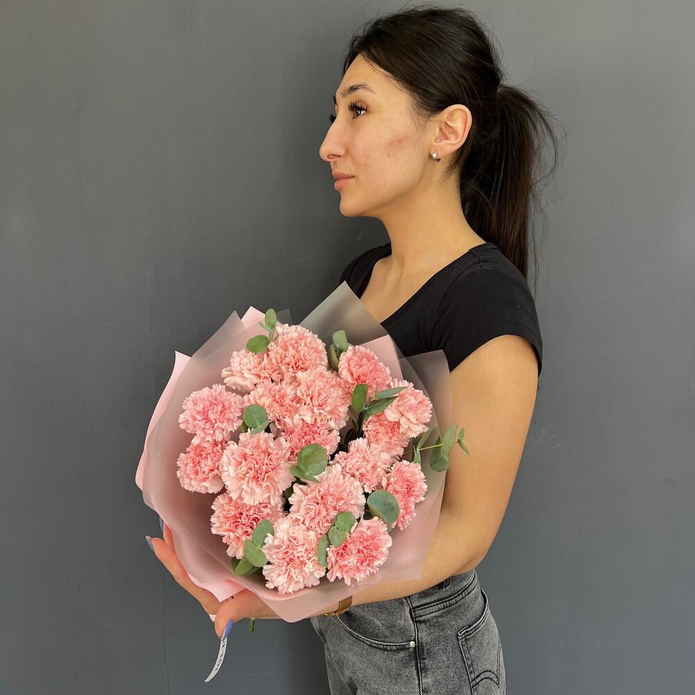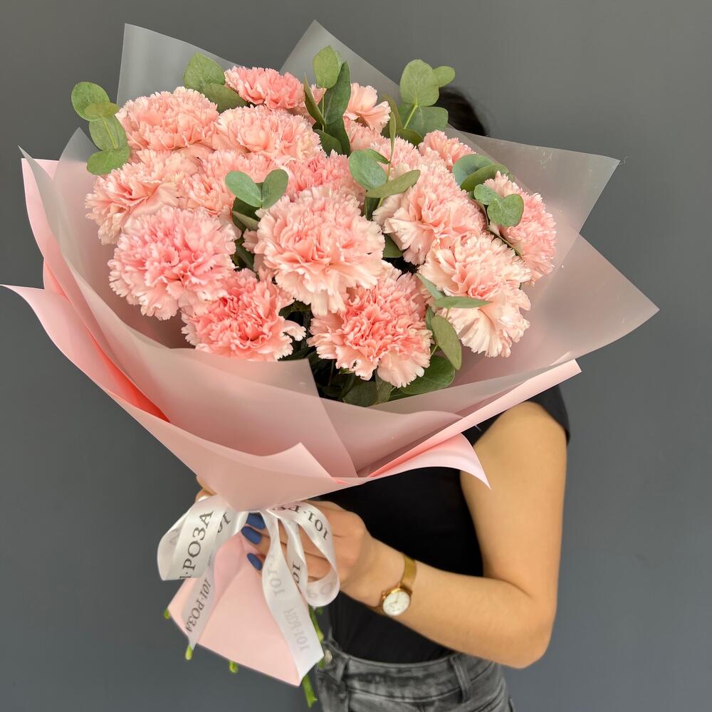 Эвкалипт – 1 шт.Атласная лента – 1 шт.Диантус сортовой – 17 шт.Дизайнерская упаковка – 1 шт.