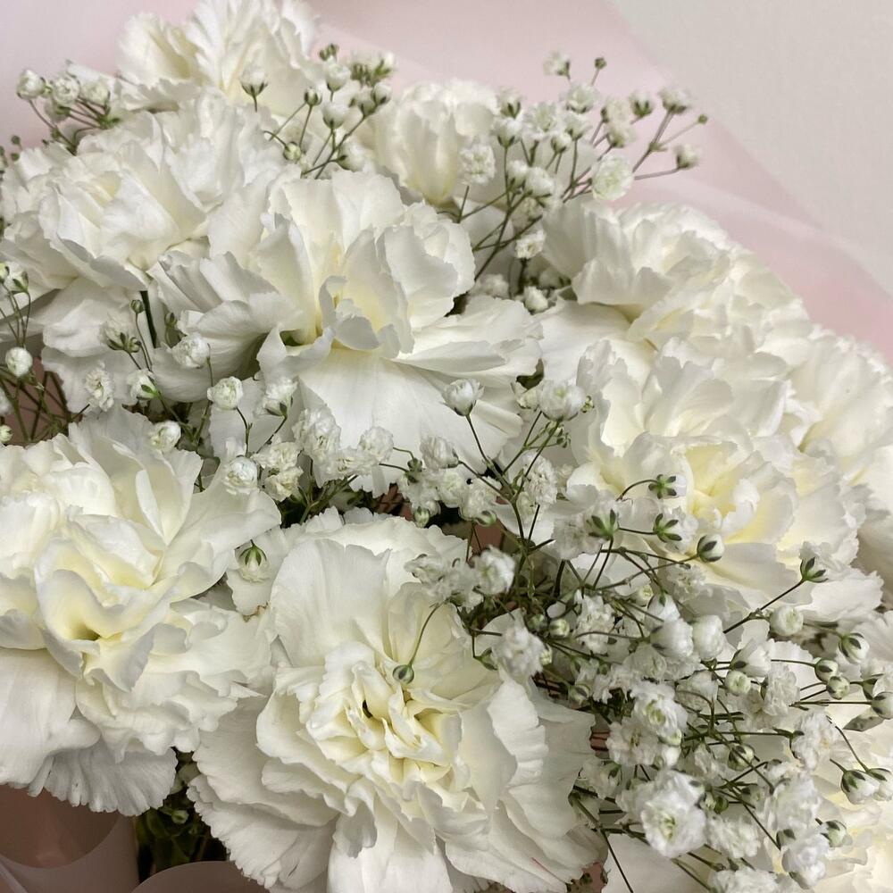 гипсофила белая ветки – 2 шт.Гвоздика сортовая – 11 шт.Упаковка дизайнерская – 6 шт.Лента атласная – 3 шт.