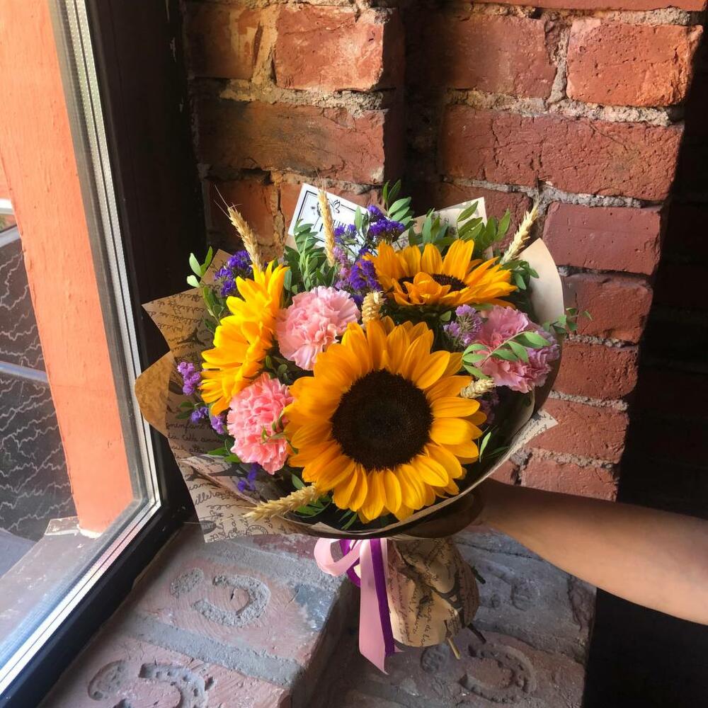 Букет с подсолнухами, гвоздикой и статицей “Яркие краски”