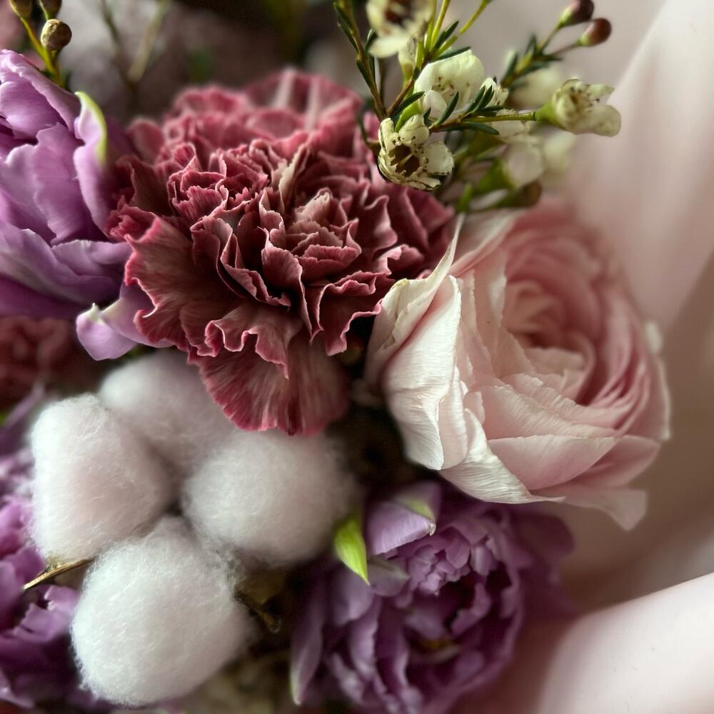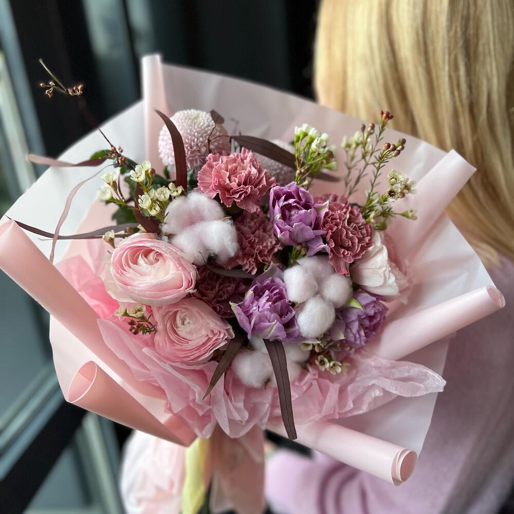 Ранункулюс – 3 шт.Хризантема одноголовая – 2 шт.Диантус – 4 шт.Тюльпан пионовидный – 3 шт.Хлопок (сухоцвет) – 3 шт.Хамелациум – 2 шт.Эвкалипт – 1 шт.Упаковка дизайнерская – 2 шт.Лента атласная – 1 шт.