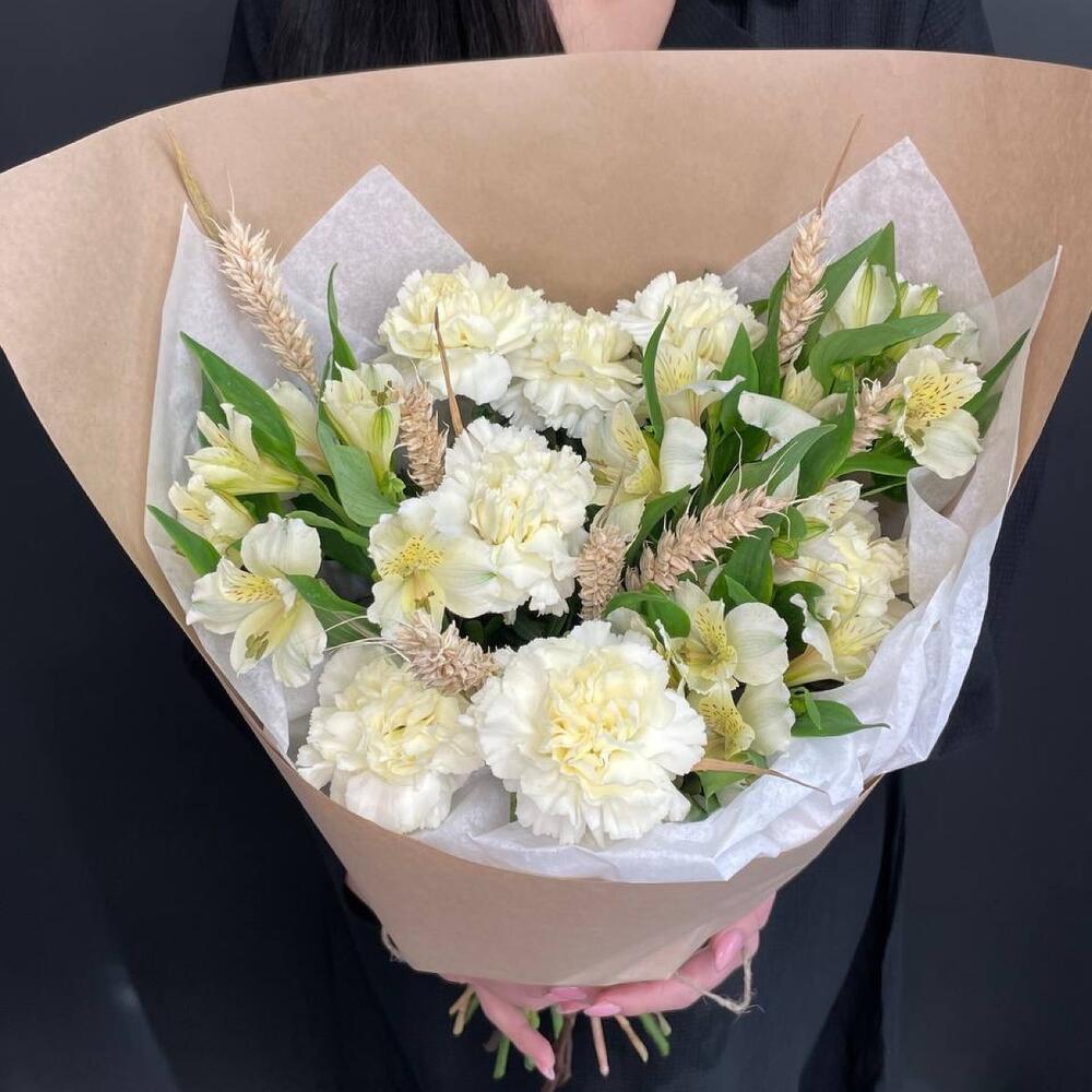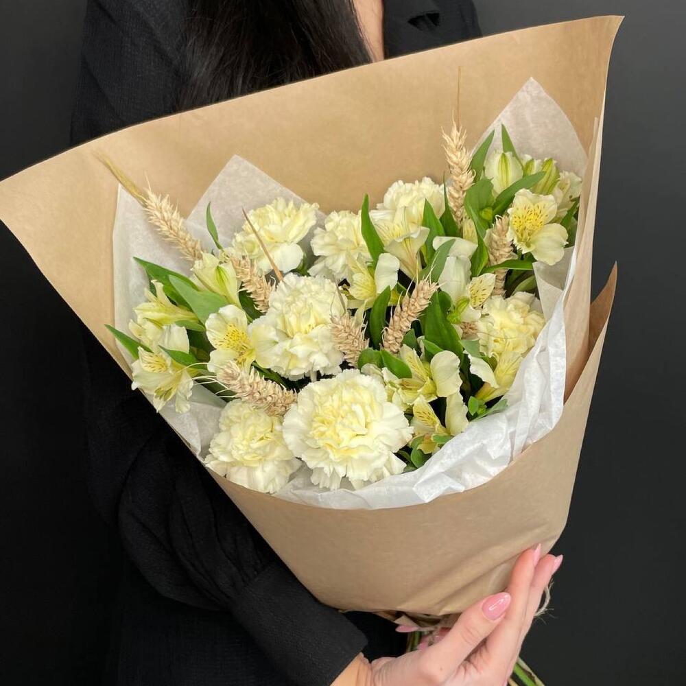 Альстромерия – 7 шт.Тишью – 4 шт.Диантус – 7 шт.Колосья – 15 шт.Крафт дизайнерский – 4 шт.