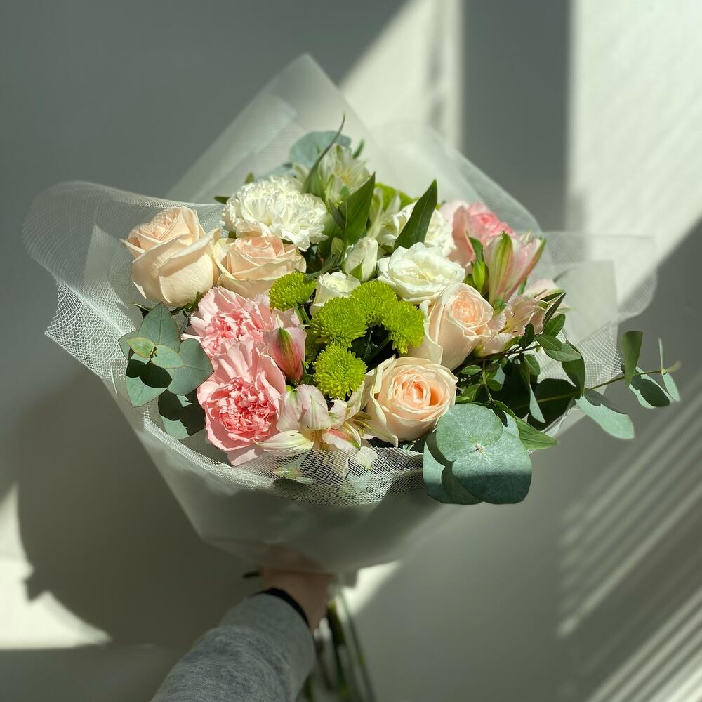Альстромерия – 3 шт.Роза – 4 шт.Зелень – 5 шт.Упаковка – 7 шт.Гвоздика – 5 шт.Сантини – 1 шт.Фисташка – 6 шт.