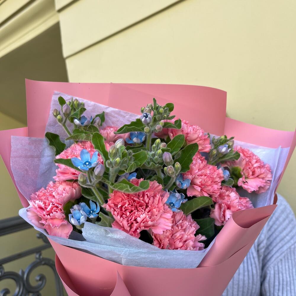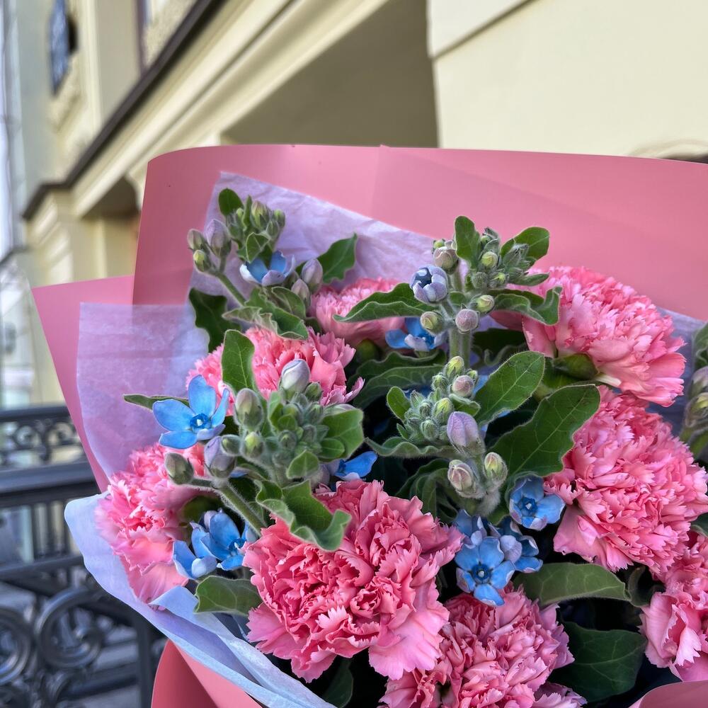 РОЗОВЫЕ ОБЛАКА – это букет, который подарит вам и вашим близким ощущение нежности и романтики. Диантусы и твидия – это цветы, которые имеют розовый и голубой и напоминают о сладких и мечтательных облаках. Этот букет – прекрасный подарок для тех, кто любит мягкие и изящные цветы.Чтобы букет радовал вас дольше, мы подарим вам специальное средство, которое надо будет добавить в вазу с холодной водой. Не забудьте подрезать цветы каждые 2 дня и менять воду – это тоже продлевает жизнь букету!