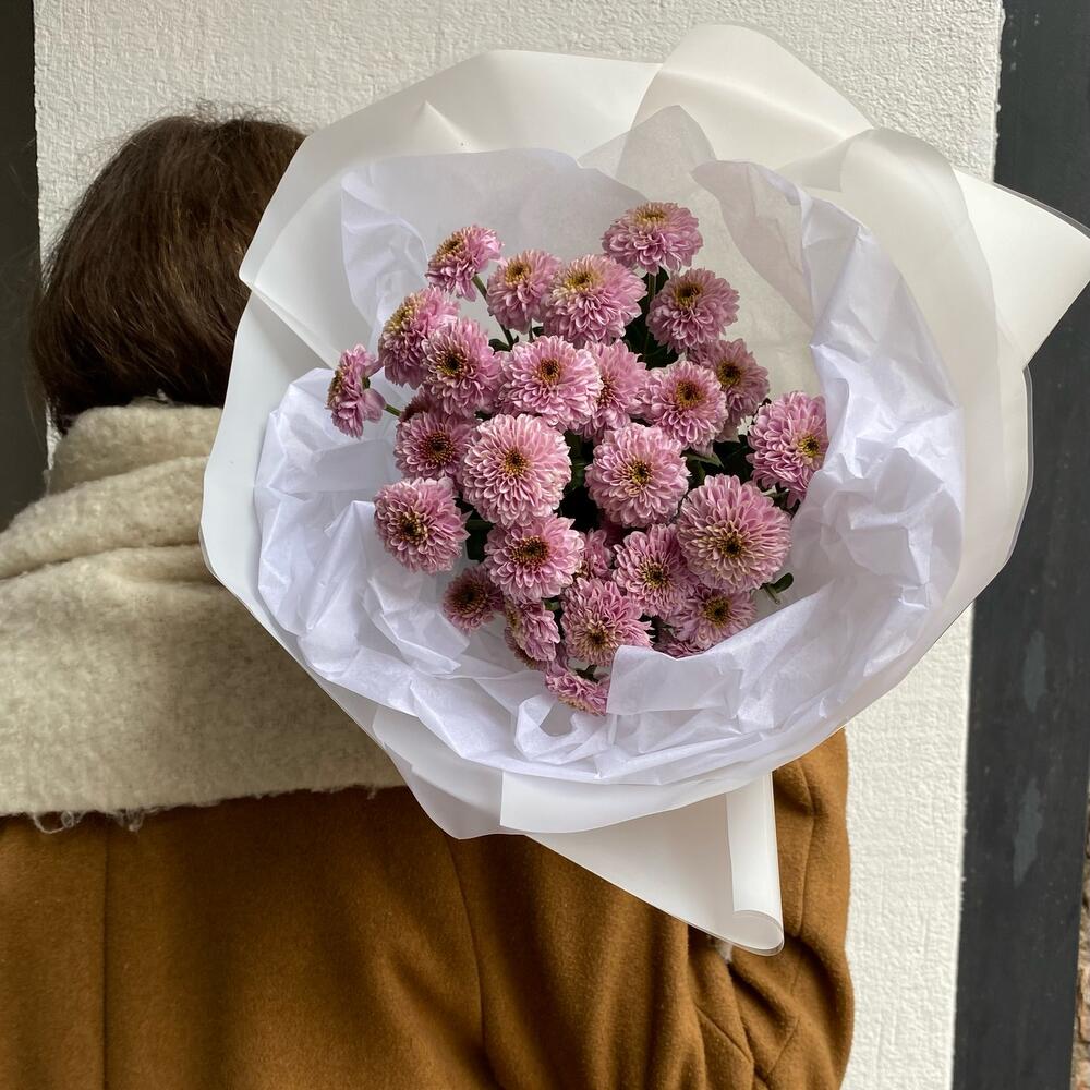 хризантема кустовая помпон – 5 шт.Тишью – 2 шт.Упаковка дизайнерская – 4 шт.Лента атласная – 1 шт.