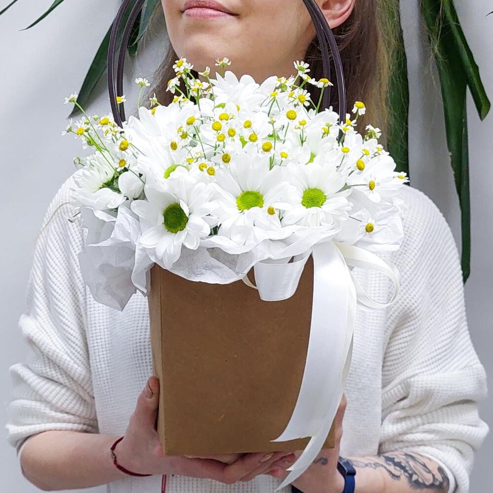 Летняя композиция в коробке-сумочке с ромашками
