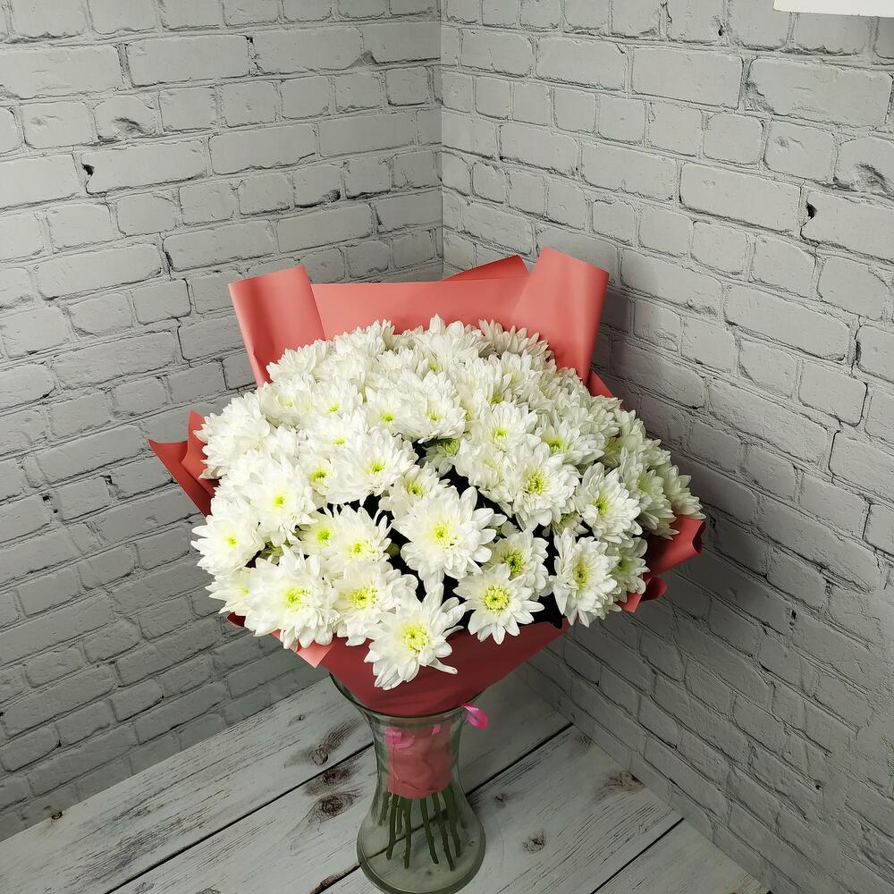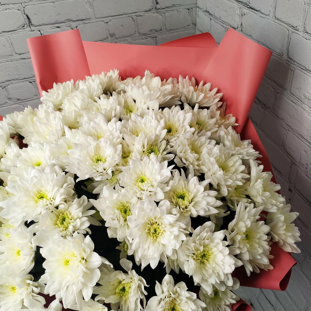 Прекрасный букет из белых хризантем, станет идеальным подарком для самых любимых и близких!Памятка для букета:1. Чистая вода раз в сутки.2. Стебли подрезаем на 0,5см при каждой смене воды.3. Ставим в прохладное место, но не у окна.4. Чтобы вода оставалась свежей, не допускайте попадания листьев и лепестков в воду.Друзья, обратите внимание, что цвет упаковки может быть другим, в зависимости от наличия на складе.