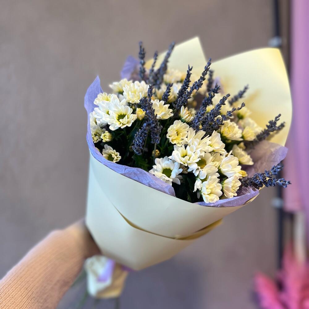 «Лавандовое созвездие» Букет из розы, гвоздики, статица и хлопка