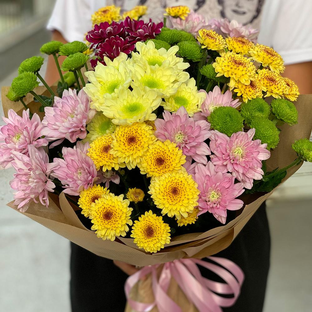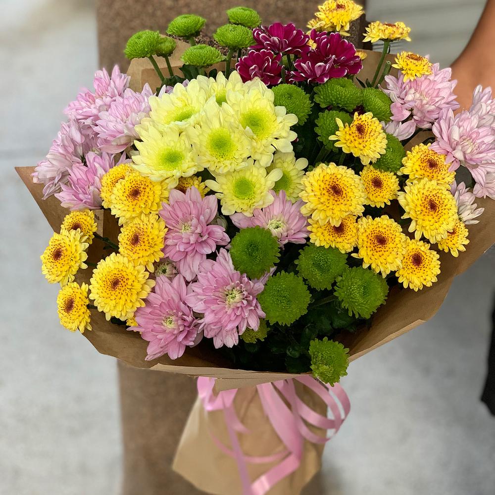 Яркий букетик из разноцветных хризантем в стильном оформлении бумаге крафт.