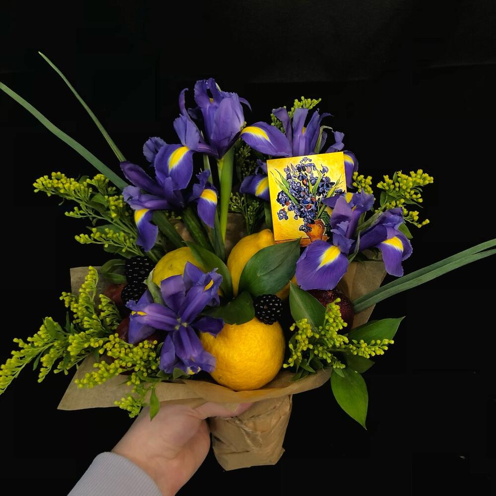 Ирис – 5 шт.Рускус – 3 шт.Солидаго – 4 шт.Лимон – 3 шт.Слива – 3 шт.Ежевика – 3 шт.репродукция ван гога «ирисы» – 1 шт.