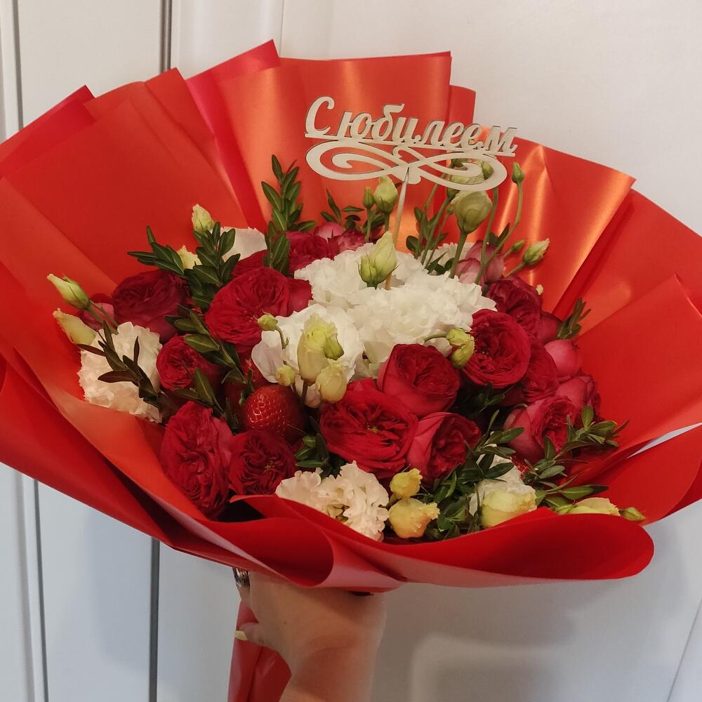 Клубника – 1200 гр.Лизиантус белый – 8 шт.розы кустовые красные 50 см – 8 шт.зелень декоративная – 10 шт.Упаковка дизайнерская – 1 шт.