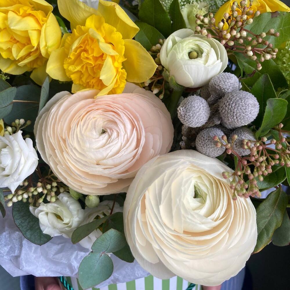 Ранункулюс – 5 шт.Нарцисс – 9 шт.Бруния – 2 шт.Вибурнум – 1 шт.Амми – 2 шт.Лизиантус – 2 шт.Ковыль – 2 шт.Эвкалипт – 5 шт.Оазис флористический – 2 шт.