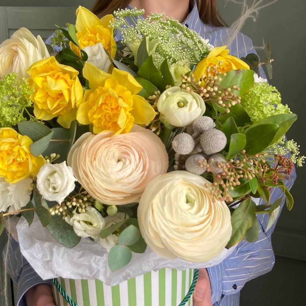 Композиция в шляпной коробке с ранункулюсами и нарциссами