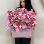 Орхидеи с рускусом в шляпной коробке. Букет 278 ALMOND ROSES