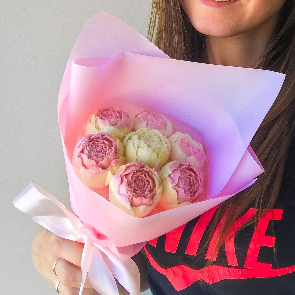Атласная лента – 1 шт.Прозрачная пленка – 1 шт.авторская пленка – 1 шт.шоколадные пионы из бельгийского шоколада – 7 шт.