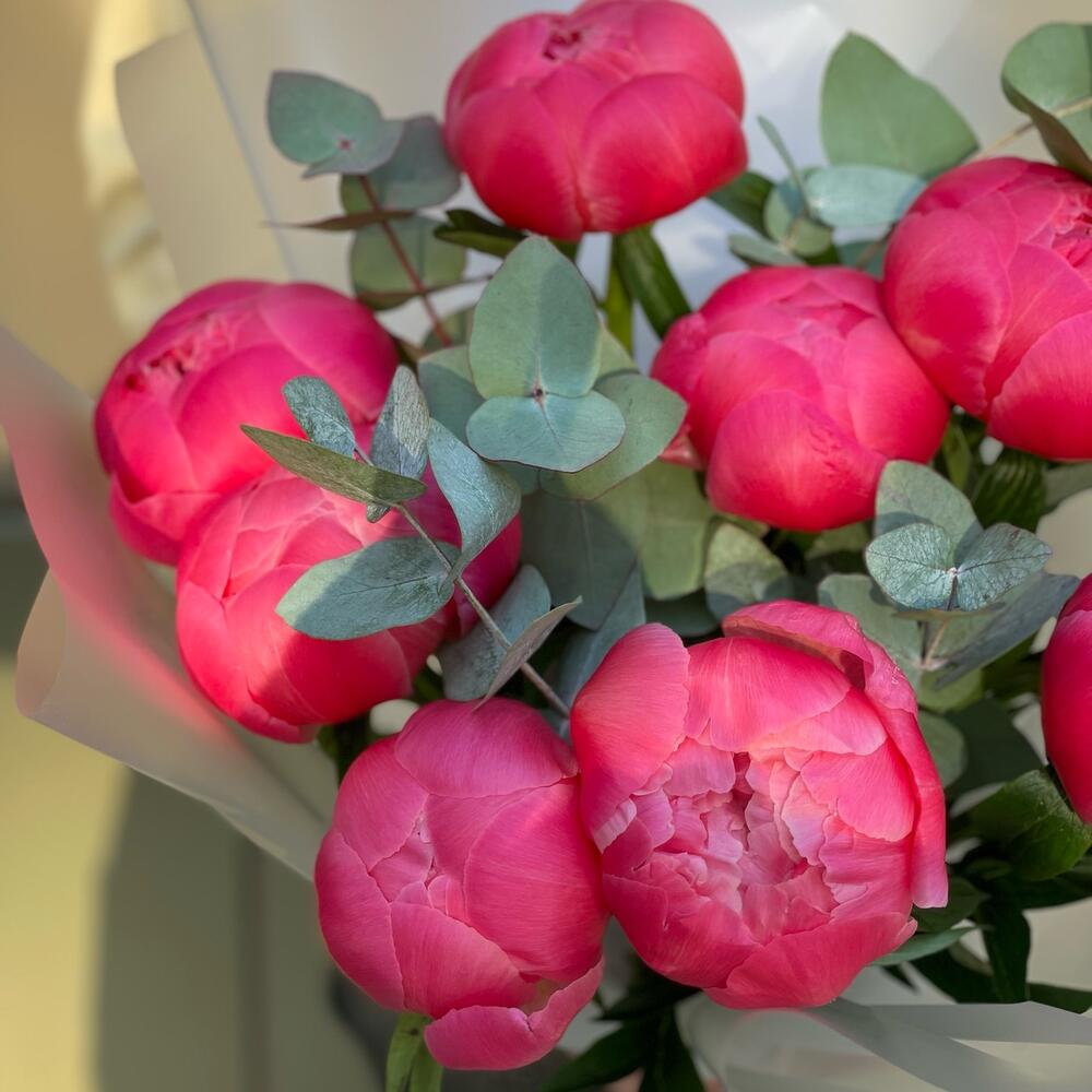 Пион Коралл Шарм (Coral Charm) – 9 шт.Эвкалипт – 4 шт.Лента атласная – 2 шт.Упаковка дизайнерская – 4 шт.