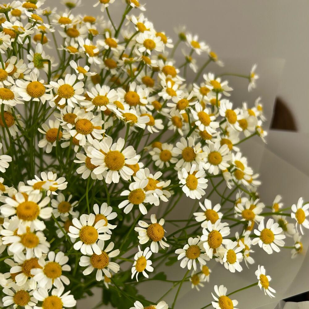 Лента атласная – 2 шт.Упаковка дизайнерская – 3 шт.ромашка кустовая танацетум – 9 шт.