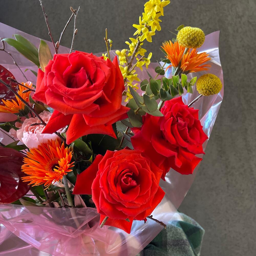 Пионовидная роза – 5 шт.Антуриум – 2 шт.Гербера сортовая – 3 шт.Форзиция – 1 шт.Краспедия – 2 шт.Зелень – 5 шт.Роза кустовая пионовидная – 1 шт.Упаковка дизайнерская – 3 шт.