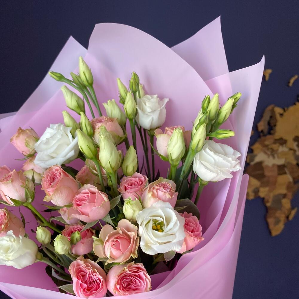 Авторский букет с кустовой розой и лизиантусом