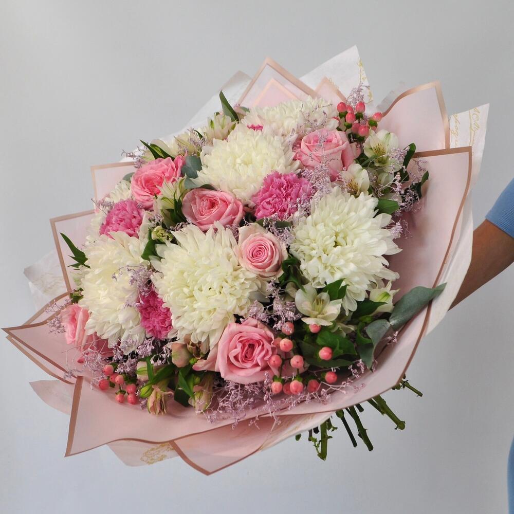 Альстромерия – 5 шт.Гиперикум – 3 шт.Эвкалипт – 6 шт.Лента атласная – 1 шт.Диантус – 5 шт.Роза пионовидная – 9 шт.Хризантема одноголовая – 7 шт.Упаковка дизайнерская – 6 шт.кермек розовый – 6 шт.