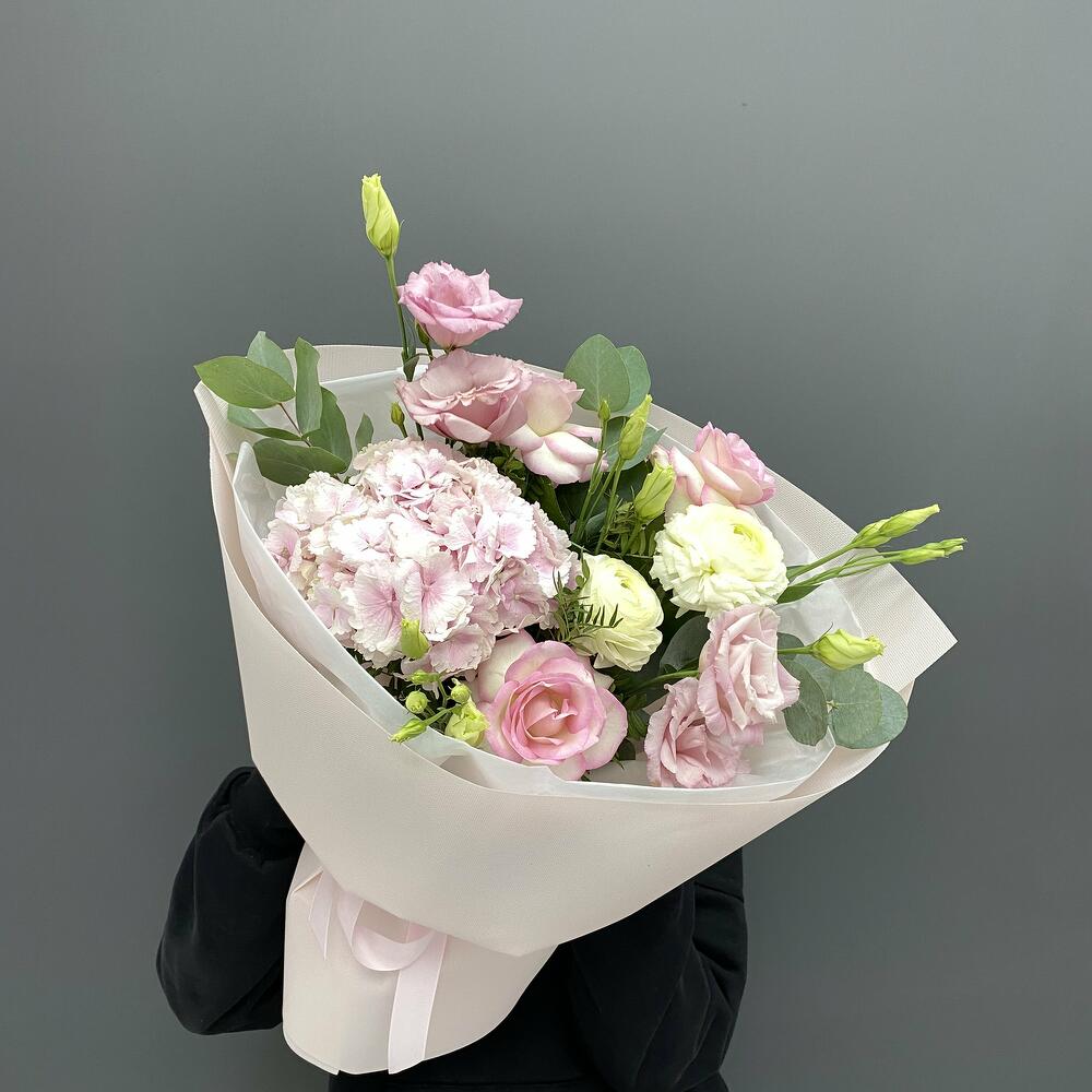 Альстромерии, Гортензии, Кустовые розы, Лизиантусы, Розы, Хризантемы