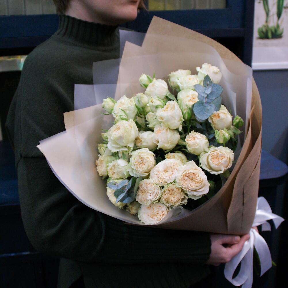 Эвкалипт – 1 шт.Пленка матовая – 2 шт.Крафт – 1 шт.Атласная лента – 2 шт.Роза кустовая пионовидная – 5 шт.