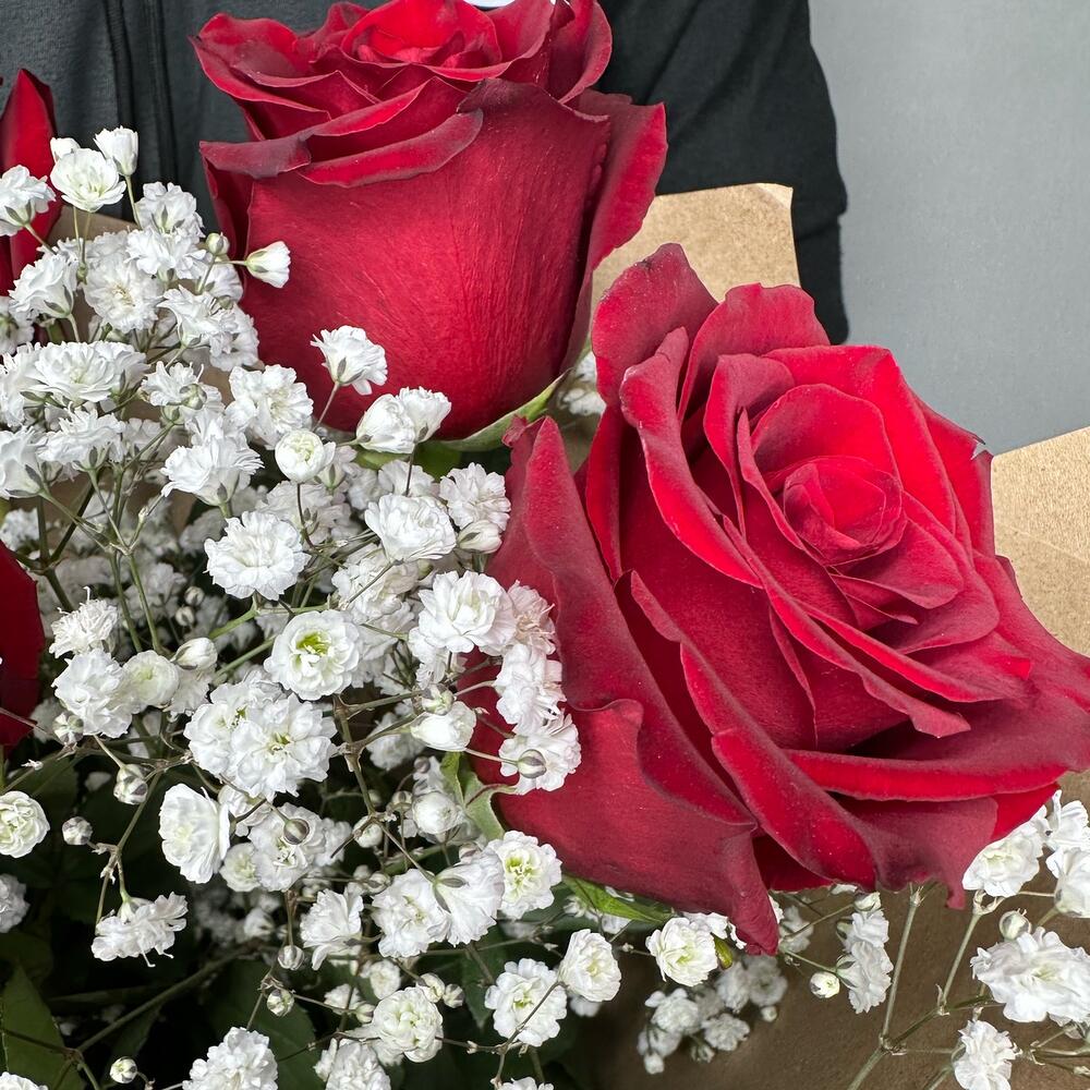 Букет из 7 красных роз и белой гипсофилы “Классика”