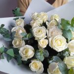 Роза – 21 шт.Эвкалипт – 6 шт.Дизайнерская упаковка – 1 шт.Лента атласная – 1 шт.подкормка для срезанных цветов – 1 шт.