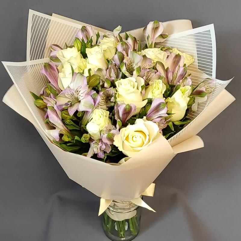 Букет из белых роз и фиолетовых альстромерий М