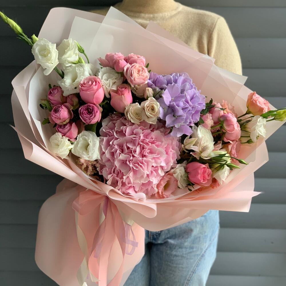 Альстромерии, Гортензии, Кустовые розы, Лизиантусы, Розы, Хризантемы