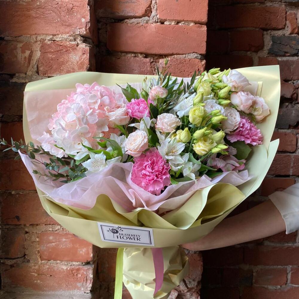 Категорий: Альстромерии, Гвоздики, Гортензии, Кустовые розы, Лизиантусы, Розы