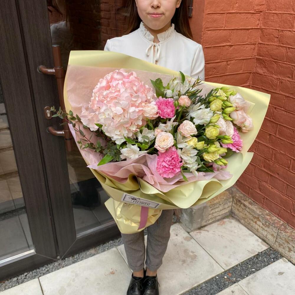 Гортензия – 1 шт.Альстромерия – 4 шт.Эустома – 2 шт.Роза кустовая пионовидная – 2 шт.Гвоздика – 3 шт.Эвкалипт – 2 шт.Упаковка – 2 шт.