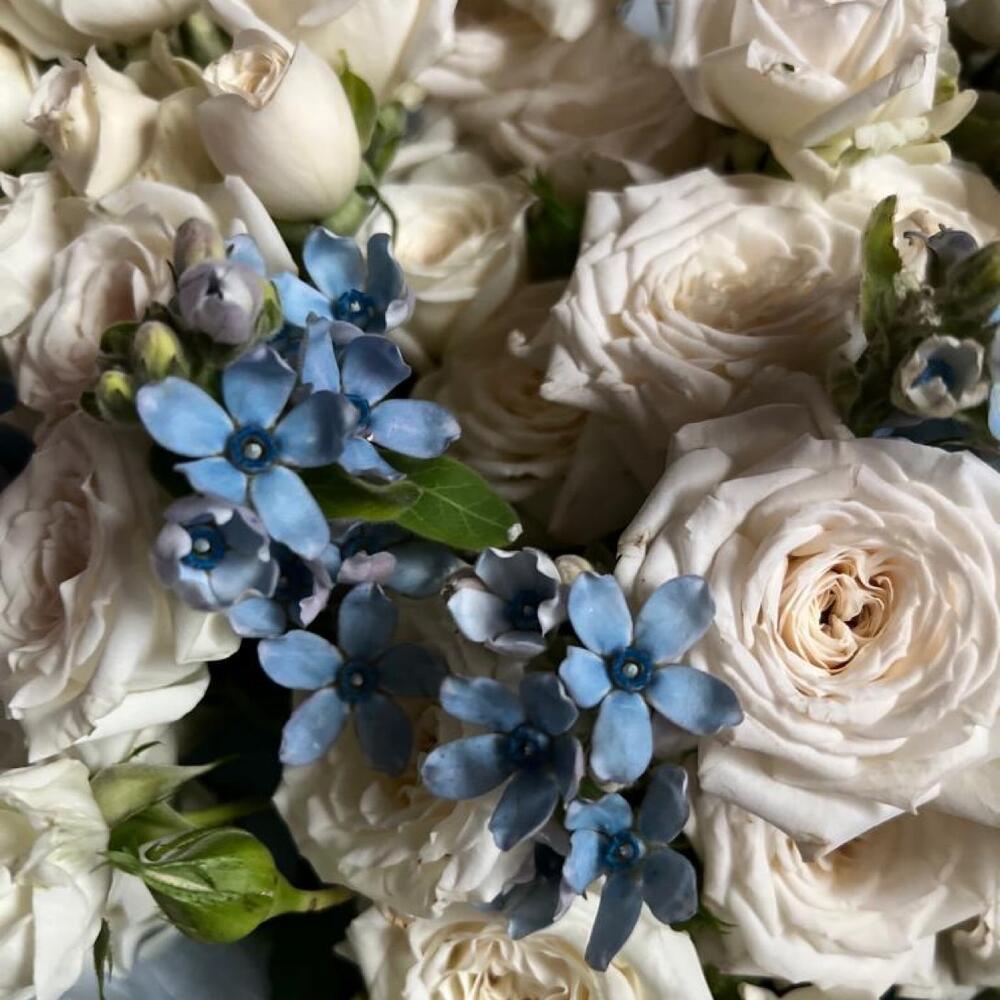 Кустовая роза – 13 шт.Оксипеталум – 14 шт.декоративная упаковка – 1 шт.Атласная лента – 1 шт.